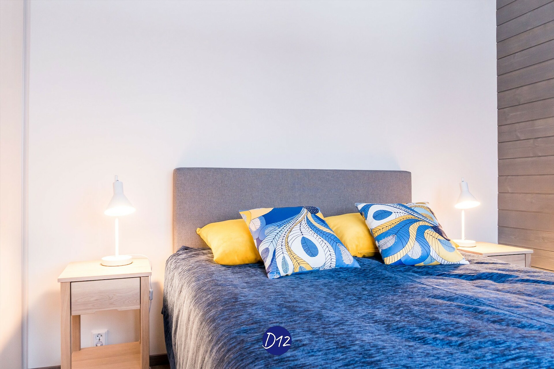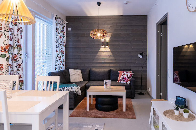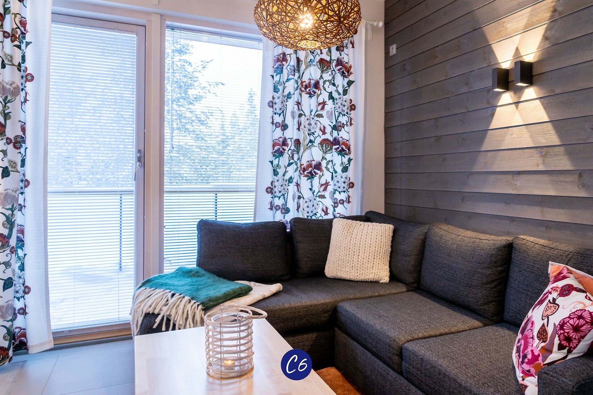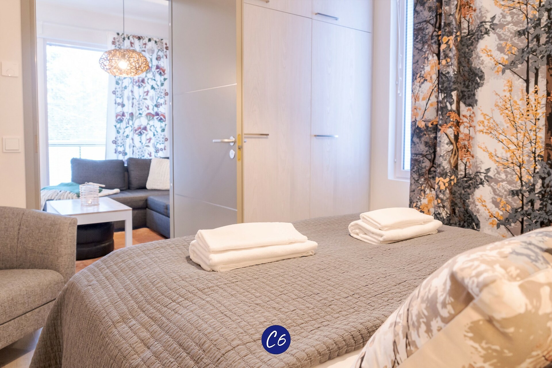 Kodikkaassa alppitalohuoneistossa majoittuu mukavasti pariskunta tai pieni perhe. Asunnossa on yksi makuuhuone laadukkaalla uudella parivuoteella ja oleskelutilassa levitettävä sohva 1-2 lapselle.