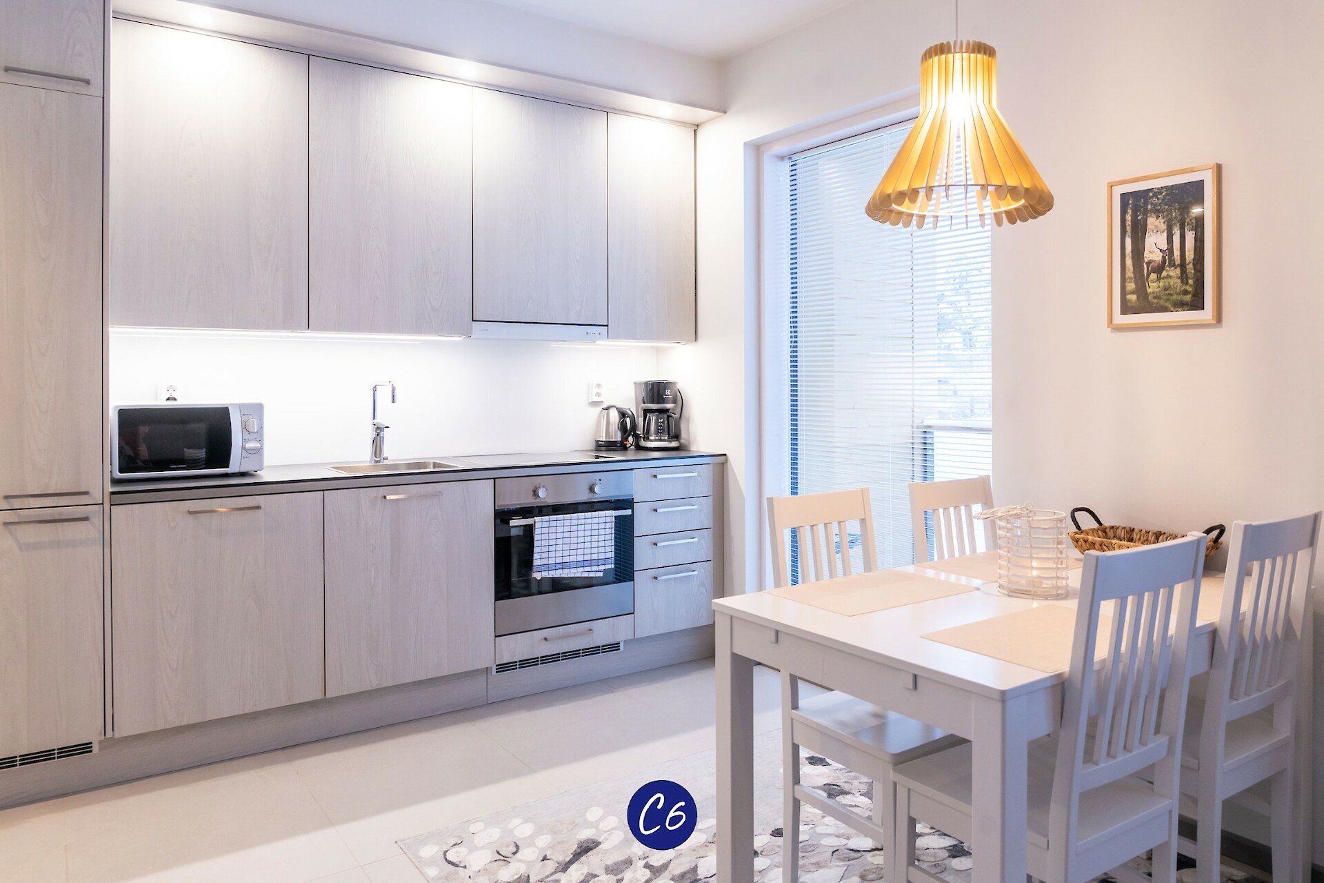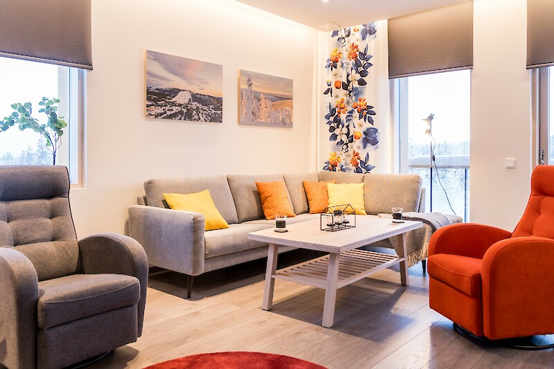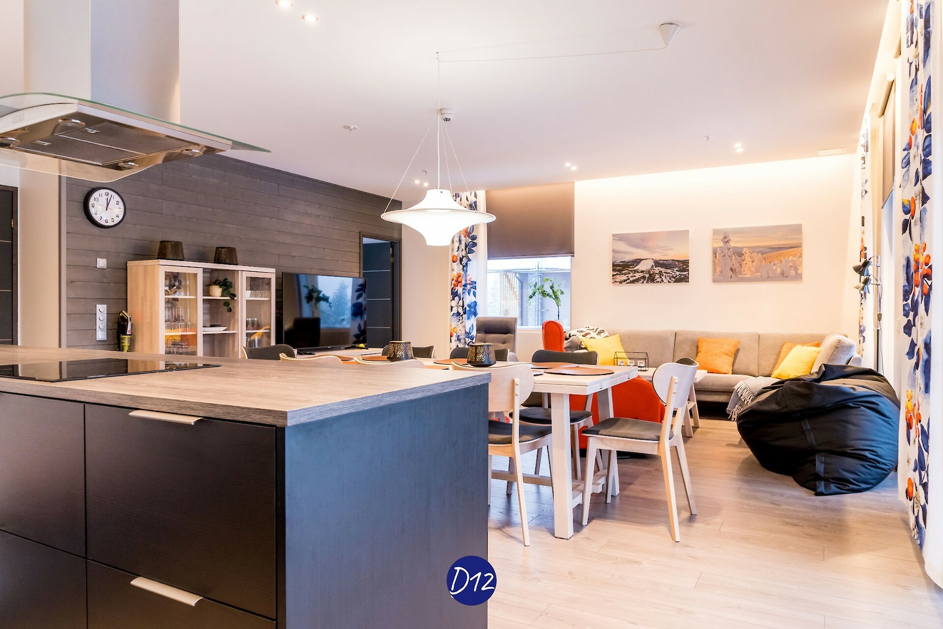 Todella tilavassa ja hyvin varustellussa keittiö- ja oleskelutilassa on mukava ruokailla ja viettää aikaa yhdessä. Sauna- ja pesutilojen lisäksi huoneistossa on erillinen wc. Varusteluun kuuluu myös pyykinpesukone ja kuivauskaappi. Autolle on pistokkeellinen autokatospaikka ja varusteille lämmin varastotila. Pulkat, syöttötuoli, matkasänky ja lastenrattaat saatavilla.