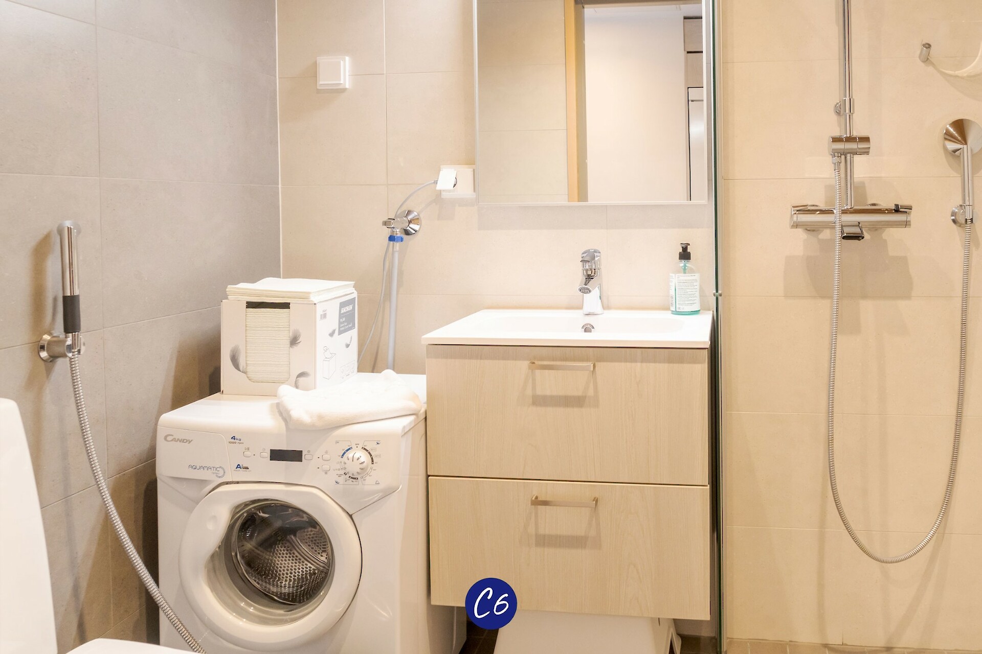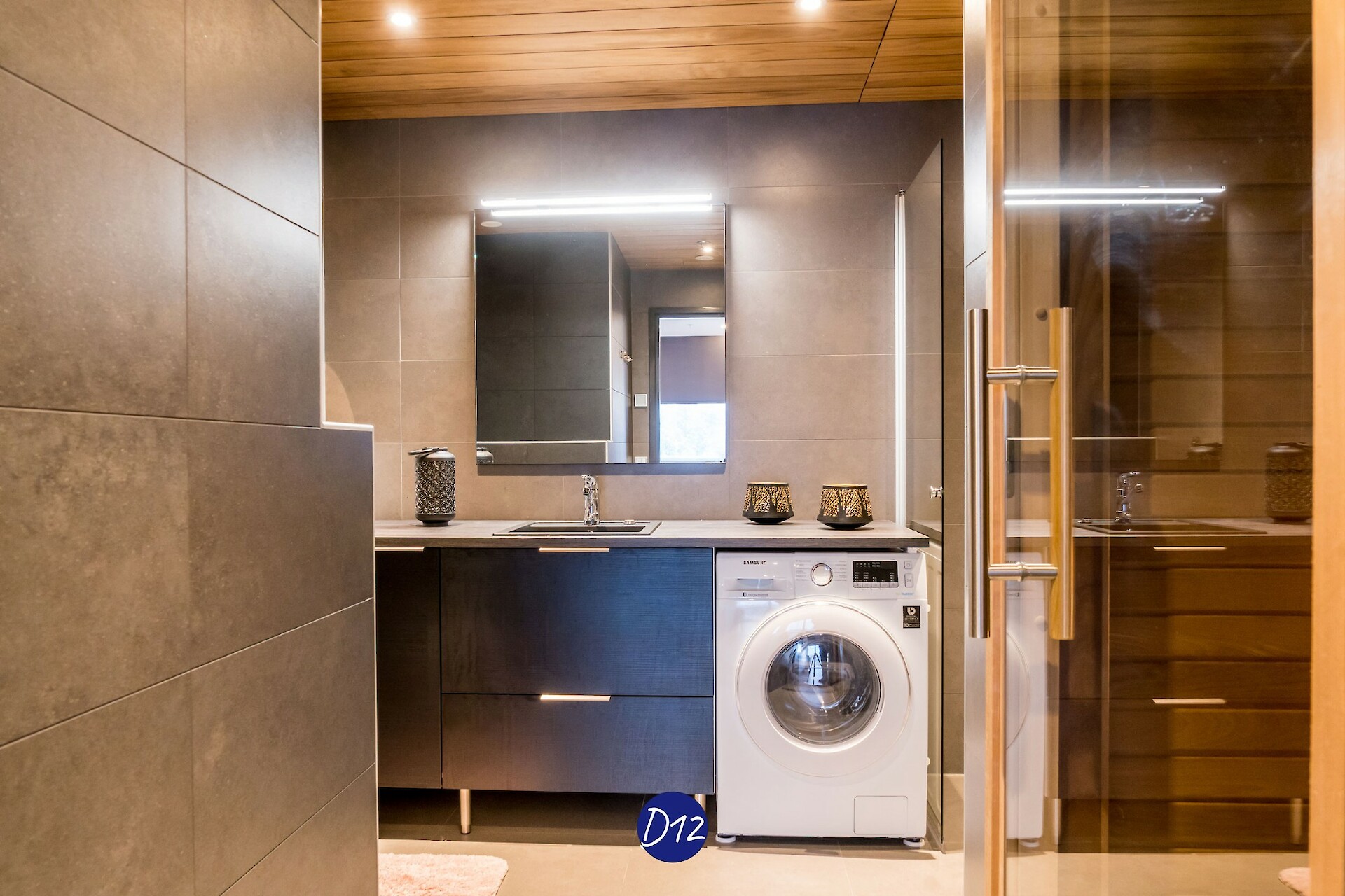 Ruokailu onnistuu hyvin varustellussa keittiössä, joka on oleskelutilan yhteydessä. Asunnossa on lisäksi sauna, suihku, wc, pyykinpesukone ja kuivauskaappi. Parvekkeellinen asunto on vuonna 2018 valmistuneen hissillisen alppitalon toisessa kerroksessa.